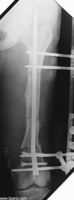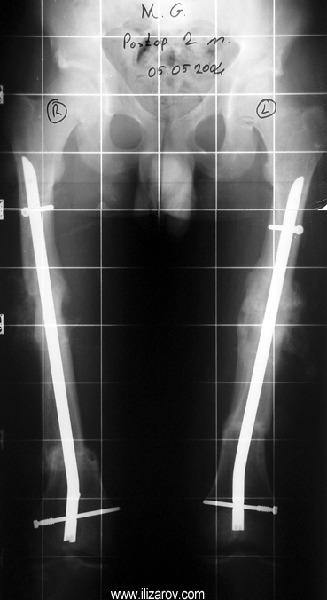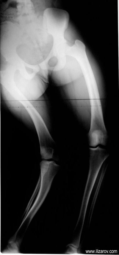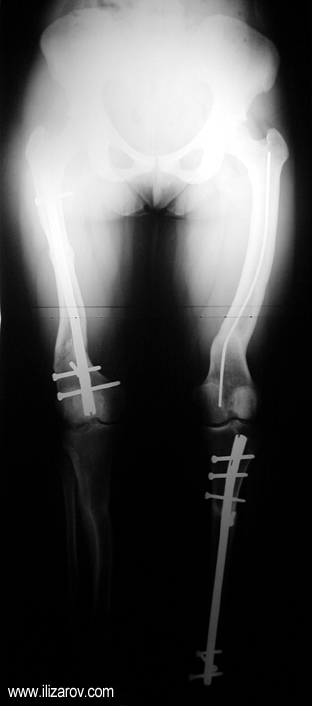 Because the deformity caused by hypophosphatemic rickets is very close to the growth plate, a significant deformity and malalignment occurs. For that reason, more than one deformity centers (CORA) are found at preoperative evaluation, and osteotomy at more than one level is required to correct the deformity. The most frequently used methods to correct the deformity are acute or gradual deformity correction using the Ilizarov method or unilateral external fixator. In the ‘fixator assisted nailing’ technique, which is applied in our department, the deformity is corrected in an acute fashion with the help of an external fixator, and the extremity is stabilized by an intramedullaru nail. The external fixator is removed before the end of the surgery if no gradual lengthening is planned postoperatively. If lengthening (over nail) is planned, the fixator is removed after the completion of the lengthening procedure. As a result, the risk of pin tract infection is eliminated, correction loss and relapsing of the deformity (which are important problems in the treatment of hypophosphatemic rickets) are avoided, eary motion and full weight bearing are allowed, and comfortability of the patient is improved because the duration with external fixator is decreased.