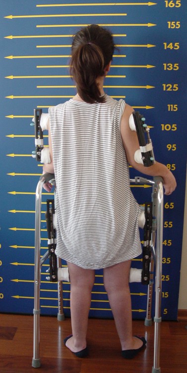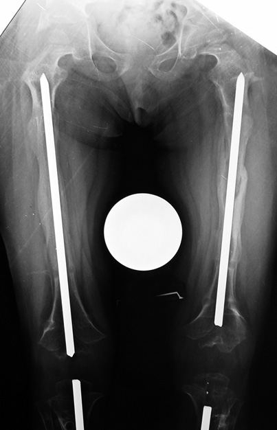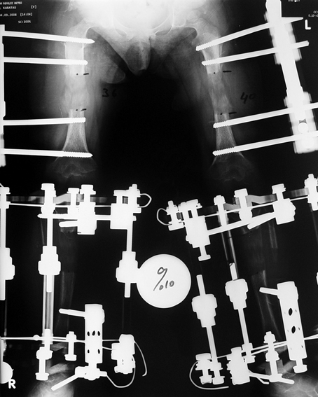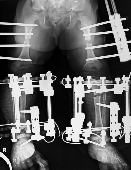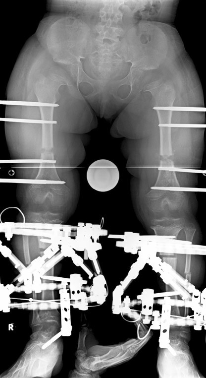 The patient cannot walk during bilateral femoral lengthening. Standing is allowed only for patient transfer. The patient can be mobilized only with wheelchair during lengthening phase. At the consolidation phase, gradually more weight bearing is allowed, and full weight bearing is allowed just before the device is removed.