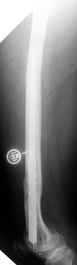 The stainless steel nail is held in place by two screws. The top of the nail is attached to a tiny, plastic-encased receiver that is placed under the skin.