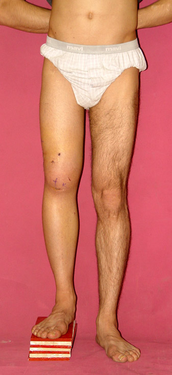 The bone is cut about 14 cm below the knee from the inside with an internal saw.