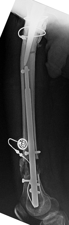 A two-centimetre incision is made at the patient’s knee, and a rimmer is used to create enough space in the bone for a stainless steel nail.