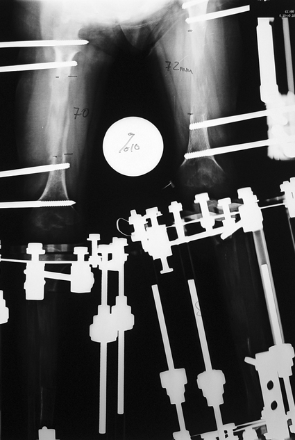The patient cannot walk during bilateral femoral lengthening. Standing is allowed only for patient transfer. The patient can be mobilized only with wheelchair during lengthening phase. At the consolidation phase, gradually more weight bearing is allowed, and full weight bearing is allowed just before the device is removed.